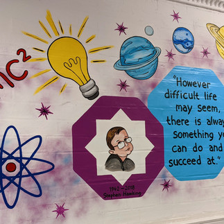 Each corridor features portraits and quotes from key indivduals related to the curriculum, all illustrated with images showcasing their achievemts. It was so much fun to research and educate myself along the way. It was also a real delight to be back in a school; surrounded by curious children and bringing a buzz back into the building.